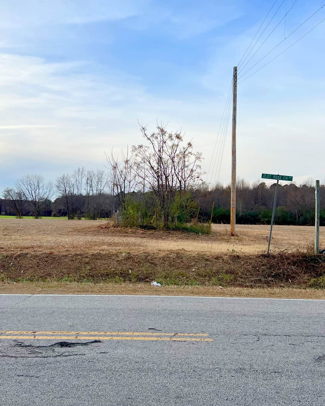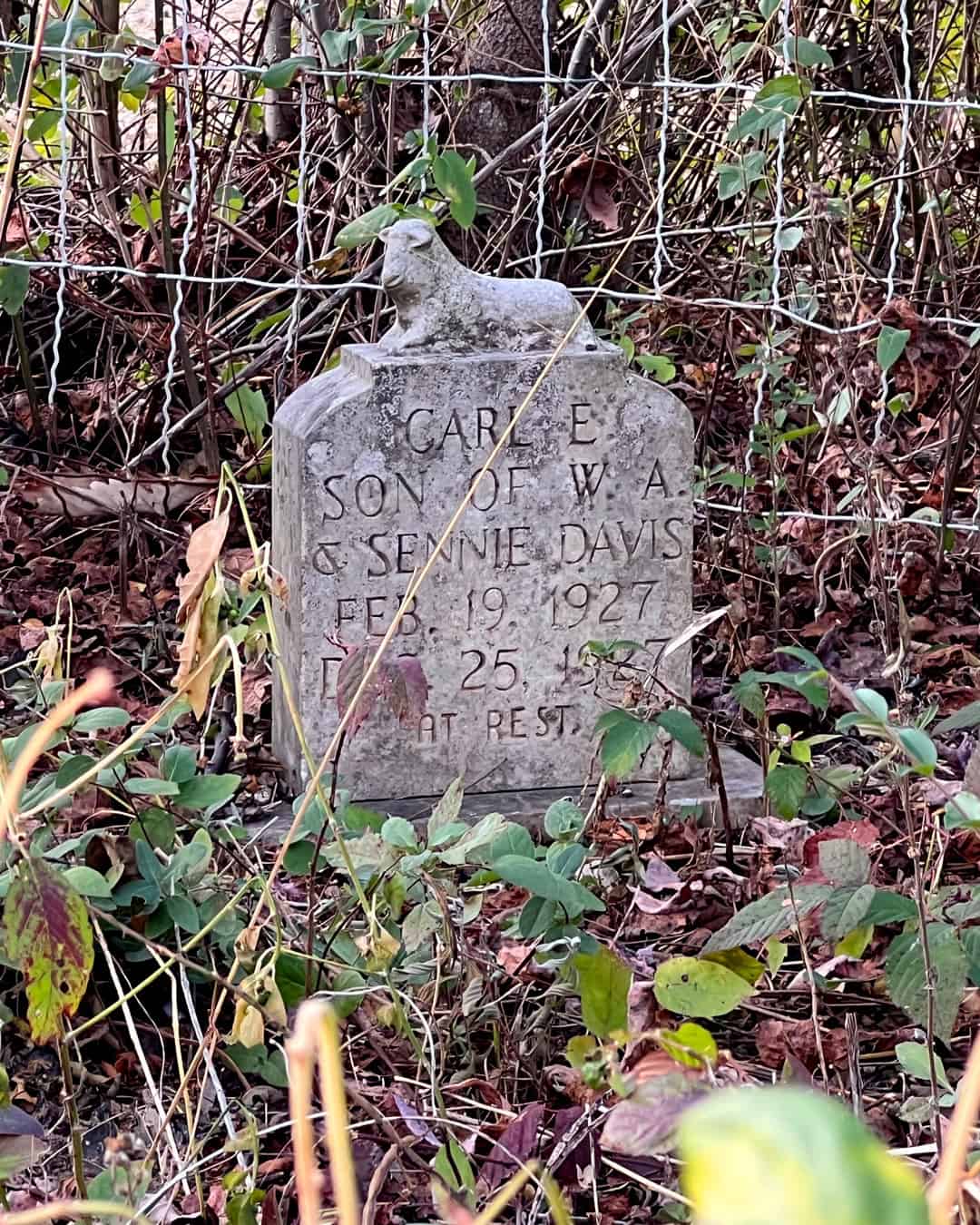 Driving through North Carolina, we stumbled upon a fenced thicket of trees alongside a county road just outside of Sims. It was a curious spot. The copse was oddly out of place, riding the edge of endless fields of harvested crops. We stopped on a chance, and our suspicions paid off. Tucked among the branches and brambles was a pair of untended graves. Markers for Roxie E. Davis and infant Carl Ervin Davis were in relatively good shape with little wear or discoloration. Later research suggests that this is the Old Davis Farm Cemetery, one of (no doubt) hundreds such burial sites across the state. One hundred or more years ago, this spot was likely rural, the distant corner of a long0standing family farm. After the family sold the property and moved away, the landscape changed but their dead stayed as they were.